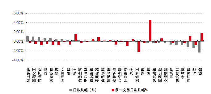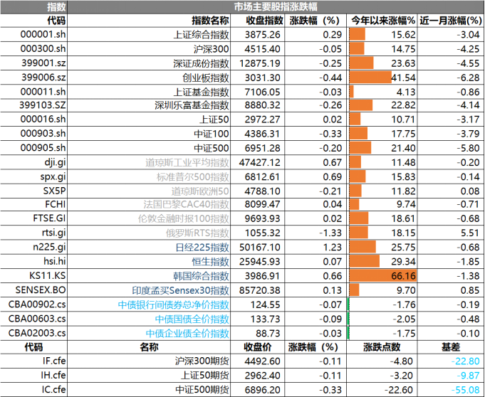 31個(gè)申萬一級(jí)行業(yè)中有13個(gè)行業(yè)上漲。其中,輕工制造、基礎(chǔ)化工、石油石化表現(xiàn)居前,漲跌幅分別為1.09%、1.01%、0.90%,商貿(mào)零售、傳媒、綜合表現(xiàn)居后,漲跌幅分別為-1.20%、-1.40%、-2.34%。滬市有1201只個(gè)數(shù)上漲,占比52.40%,深市有1529只個(gè)數(shù)上漲,占比53.20%。非ST個(gè)股中,59只個(gè)股漲停,8只個(gè)股跌停。股指期貨主力合約3個(gè)合約均上漲,其中,3只期指均弱于現(xiàn)貨指數(shù)。